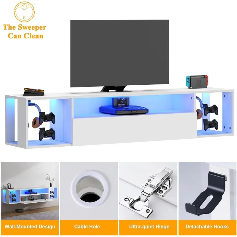 【FLOATING TV STAND WITH LED LIGHTS】This TV stand is 55″ W x 11.8″ D x 11.8″ H with 20 changed LED lights. Who doesn’t want to install such a cool LED TV stand at home?Whether you are playing games or watching TV , the blessing of cool lighting with the switch controlled will make your entertainment life more dynamic.